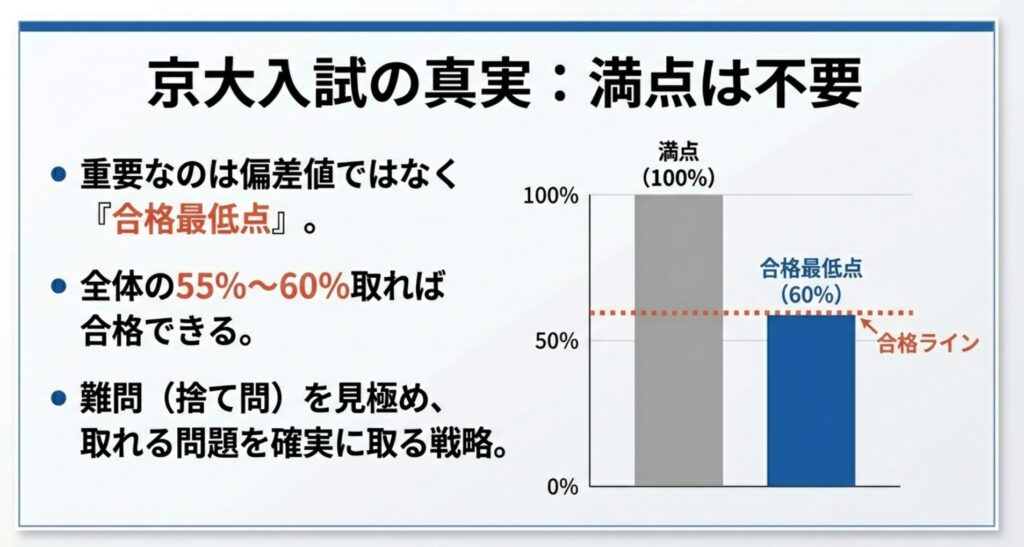 京大入試において最も重要な指標は「偏差値」ではなく「合格最低点」です。京大は入試問題が非常に難しいため、満点を取る必要はありません。学部によりますが、全体の55%〜60%程度を得点できれば合格ラインに乗ります。