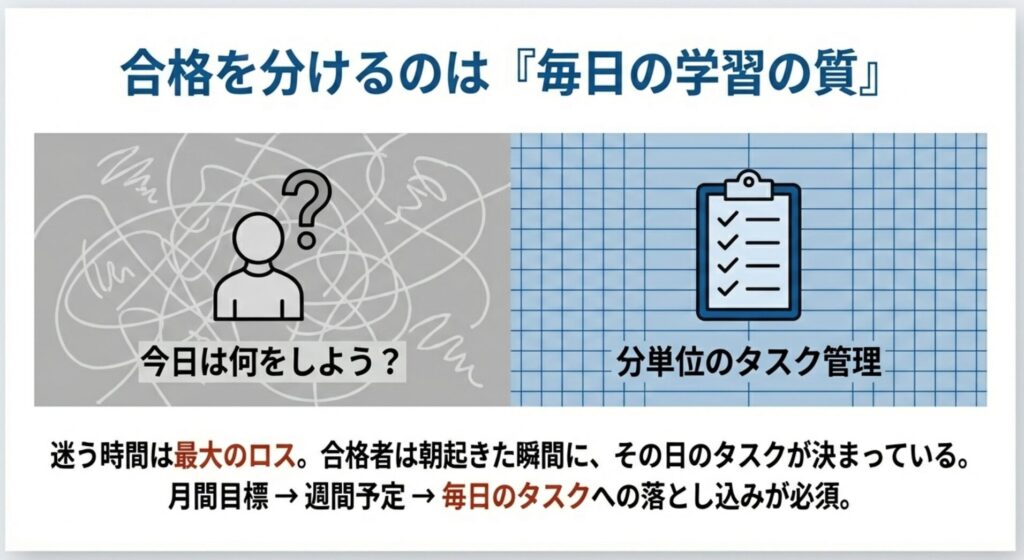 多くの受験生が陥るのが、「今日は何をしようかな」と考えている時間でロスをしてしまうこと。合格する人は、朝起きた瞬間に「今日やるべきこと」が分単位で決まっています。