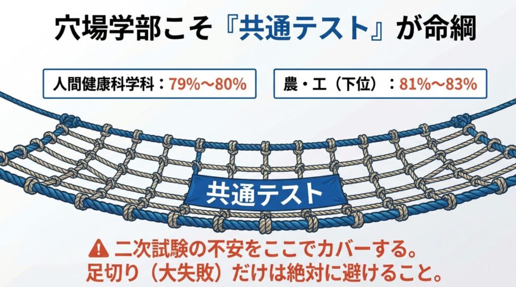 そして、意外と見落とされがちなのが共通テストの重要性です。特に医学部人間健康科学科や農学部などの「穴場学部」を目指す層は、二次試験での爆発力に欠けるケースが多いため、共通テストで確実に得点を稼いでおくことが命綱になります。