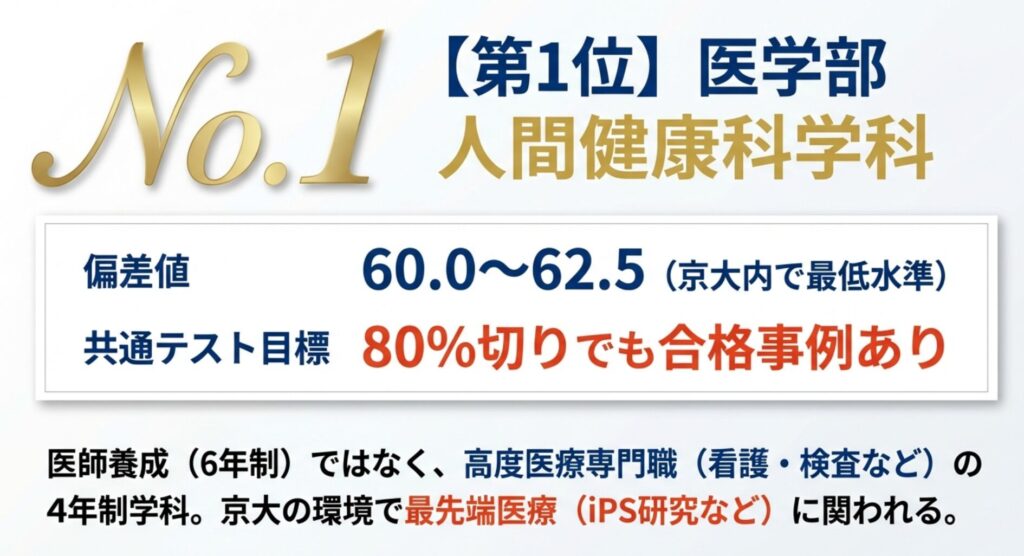 | 1位 | 医学部 人間健康科学科 | 偏差値60.0〜62.5と京大内で最も低い水準。共通テストのボーダーも80%を切ることがあり、圧倒的な穴場です。 |