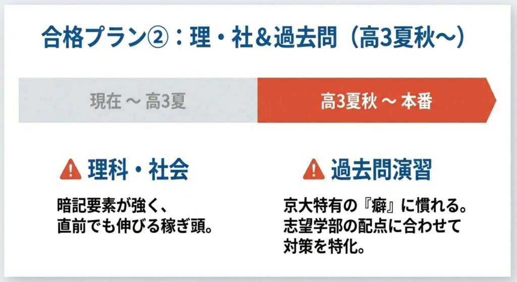 暗記要素の強い科目は、やった分だけ偏差値に直結します。ここで稼ぐのが逆転合格のセオリーです。 - 志望学部の過去問に特化する(高3秋以降)