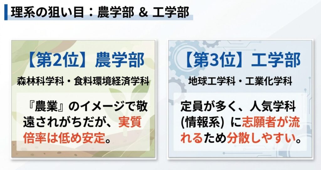 | 2位 | 農学部(森林科学・食料環境経済) | 「農学=農業」というイメージから人気が落ち着いており、実質倍率も低め安定の傾向があります。 |