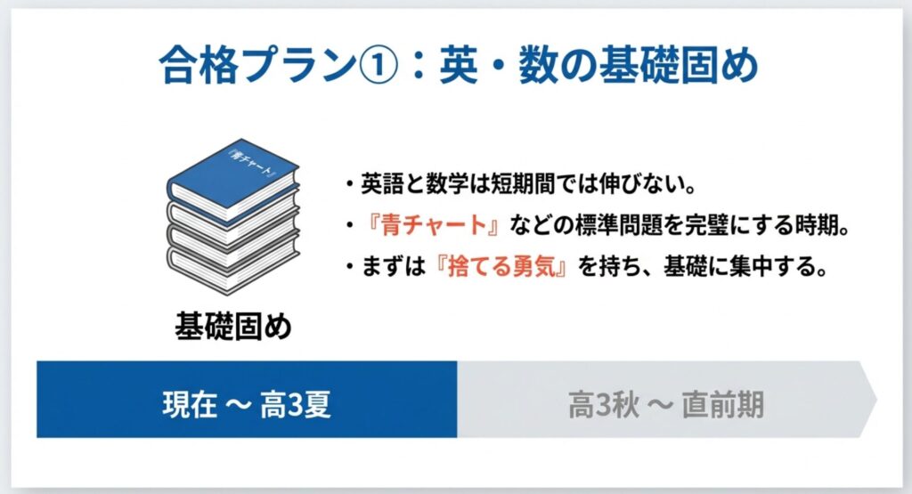 - 英語と数学の基礎を固める(高2〜高3夏まで)
