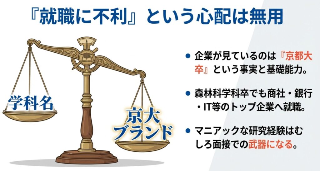 いわゆる「学歴フィルター」においても、京大であれば学部学科に関わらず最上位層として扱われます。むしろ、マニアックな研究に没頭した経験が、面接での面白いアピールポイントになることさえあります。