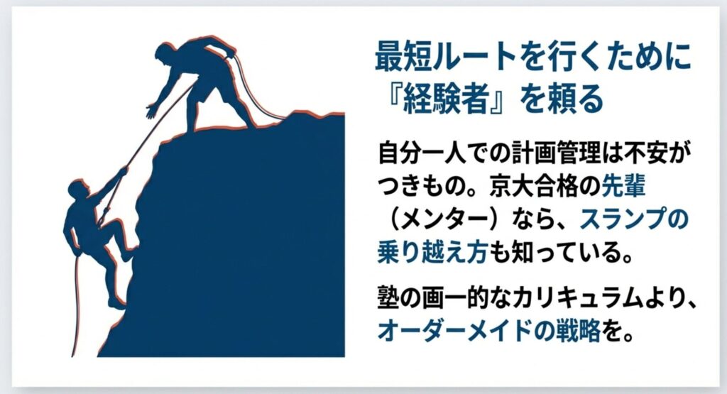 特に京大のような難関大を目指す場合、一般的な塾のカリキュラムでは対応しきれないこともあります。そこでおすすめなのが、「実際にその大学に合格した先輩」の力を借りることです。京大の入試を突破した人なら、どの時期に何をすべきか、スランプをどう乗り越えるかを経験として知っています。